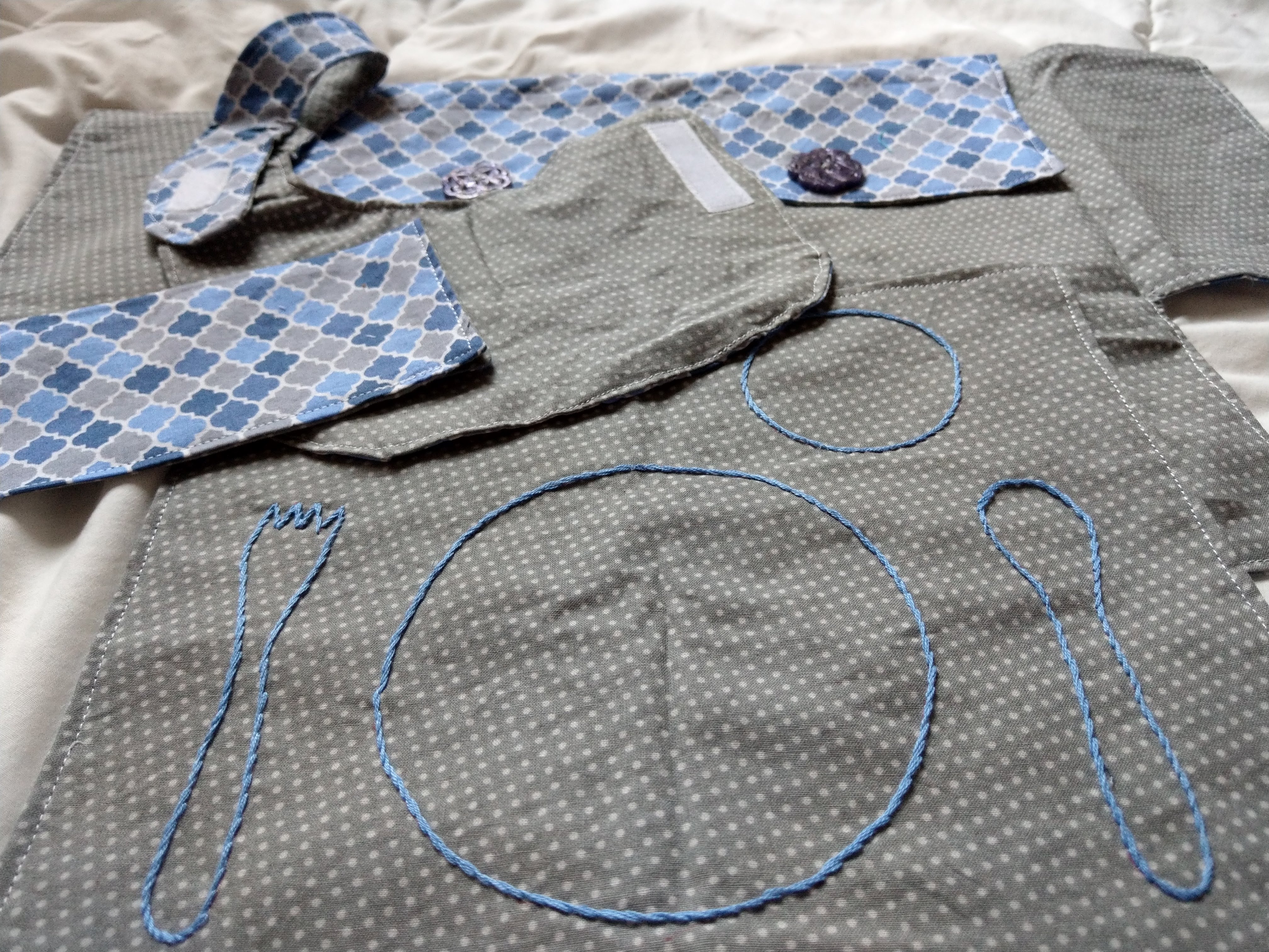 The hand-embroidered weaning set is for your child’s work at feeding herself. The embroidery allows her to set the table, knowing where the plate, fork, spoon, and glass belong at her table setting. The bib and napkin help her to stay clean as she attempts her first use at utensils to feed herself. The carrier case with large buttons for your child to unfasten independently makes it easy to take along for meals wherever you go, and for storage between meals.